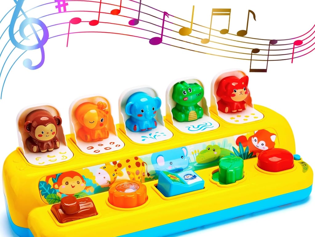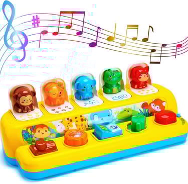Cognitive development - As she presses different buttons and listens to the notes, she’s beginning to form cause-and-effect connections (“I push, it pops up and plays sound”).