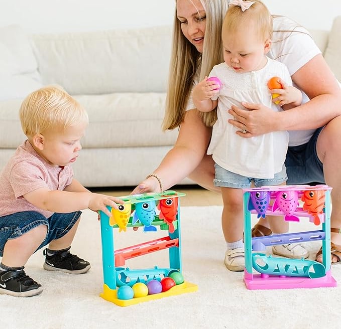 The toy features 3 hungry fish in a small play "aquarium." When the toddler “feeds” each fish with a ball, the toy reacts with cheerful phrases and music.